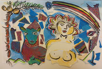 Die Gouache-Zeichnungen hingegen sind sehr reduziert und konzentriert, meist einfarbig. Neue Mischtechniken sind farbiger, siehe Abb.